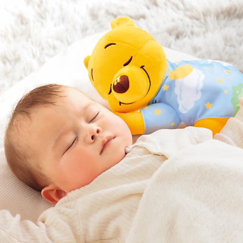 赤ちゃんの心拍数に合わせた曲で心地よい眠りに誘う「ぐっすりメロディ」と、ぐずり泣きに効果があると言われる「胎内音」が入った、くまのプーさんのぬいぐるみ。(※ぐっすりメロディとは、日本音響研究所と共同開発の寝かしつけのために開発されたオリジナル音楽。)胎内音などのやすらぐ環境音が2種類・ぐっすりメロディや子守歌、童謡など6曲収録。ぬいぐるみは手洗い可能。