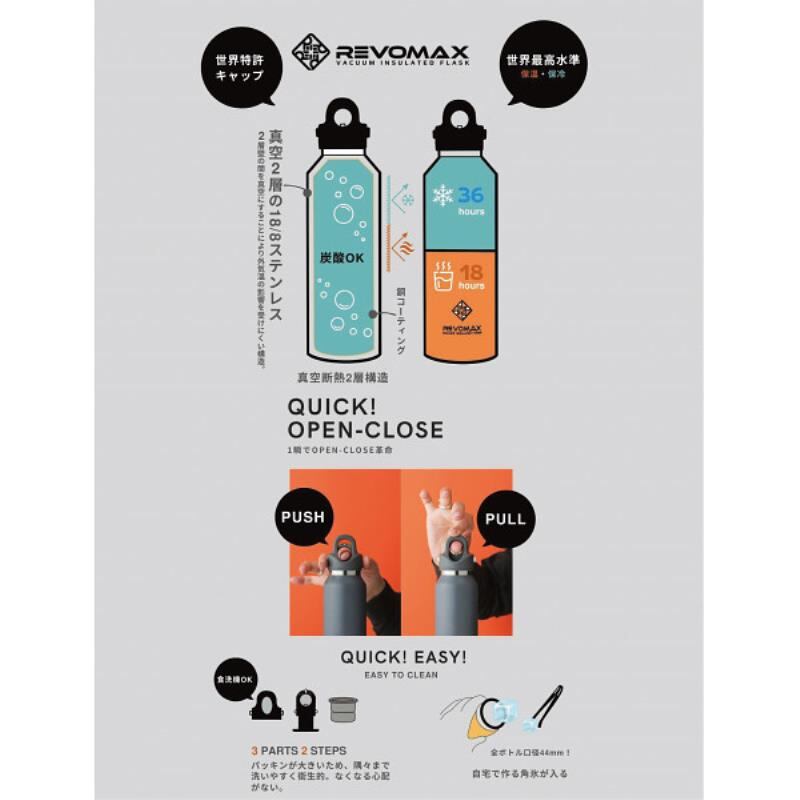 新発想のREVOMAX独自キャップは、ワンタッチで開閉可能。炭酸飲料対応。二重密閉構造で保温18時間、保冷36時間を実現。朝淹れたコーヒーやお茶などの長時間保温やキンキンに冷えたビールの長時間保冷が可能です。コンパクトな軽量スリムタイプで車のドリンクホルダーにぴったり。持ちやすく、すっと手に馴染みます。