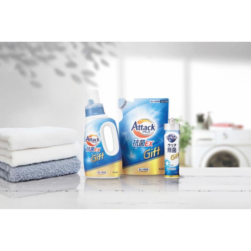 商品内容:●アタック抗菌EX本体(750g)・アタック抗菌EX詰替用(590g)・キュキュットクリア除菌本体(220ml)×各1
