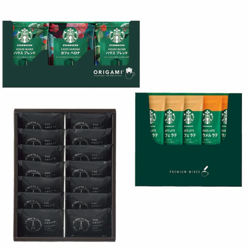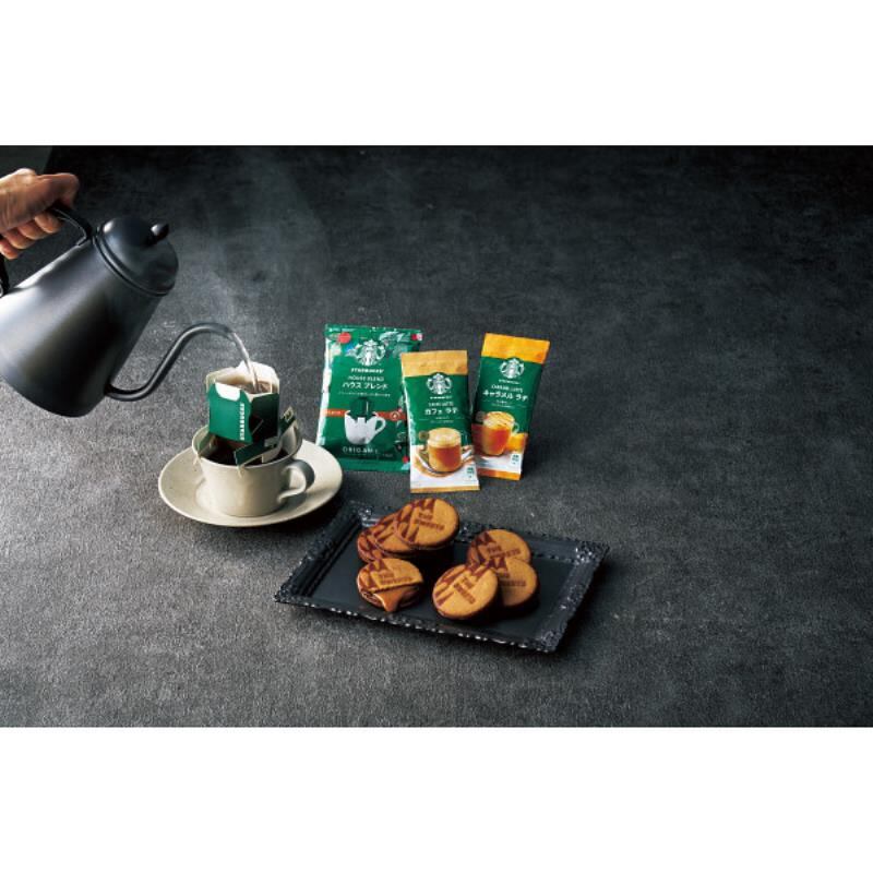 商品内容:●キャラメルサンド×14、スターバックスオリガミパーソナルドリップコーヒー(ハウスブレンド9g×3・カフェベロナ9g×2)、スターバックスプレミアムミックス(カフェラテ18g×3、キャラメルラテ23g×2)(スティック)※キャラメルサンドは溶けやすい商品のため、気温により販売時期が前後する可能性があります。