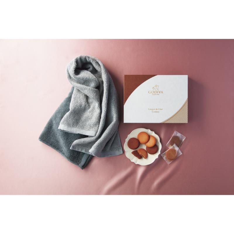 軽やかなラングドシャ生地で、チョコレートをサンドしたクッキー。「ミルクチョコレート」と「ダークチョコレート」、2種類のクッキーの詰め合わせと、柔らかな肌さわりとシルクの様な滑らかさでふんわり感が続くフェイスタオルのセットです。