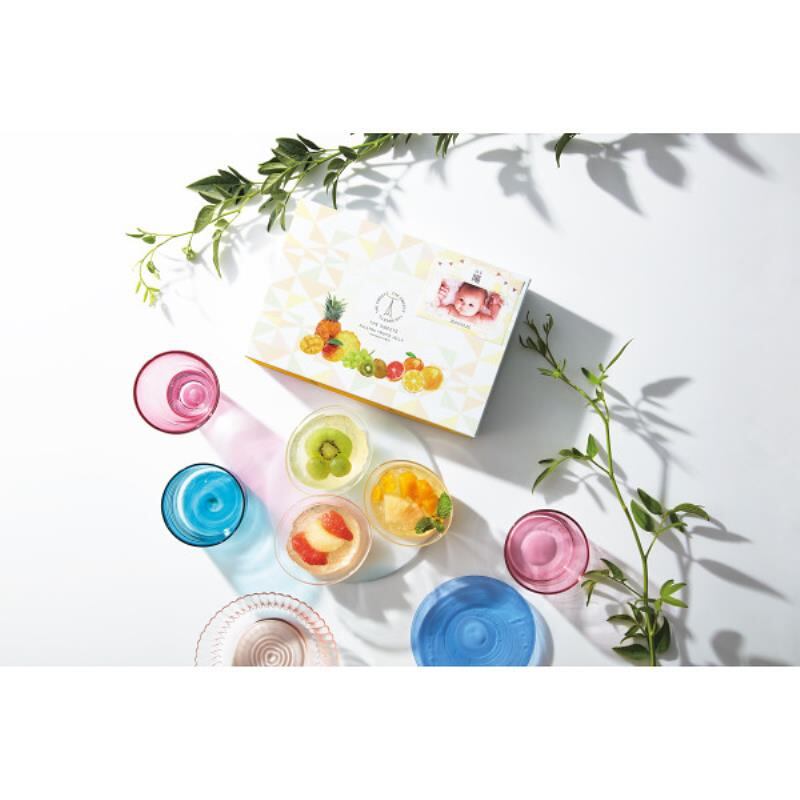 6種類のフルーツが楽しめる華やかでジューシーなゼリー。レモン果汁のゼリー液にキウイ・ぶどう・グレープフルーツ(2種)・マンゴー・パインを掛け合わせ、甘すぎない大人なゼリーに。光に反射して艶めく姿がかわいく、ギフトにもぴったりです。