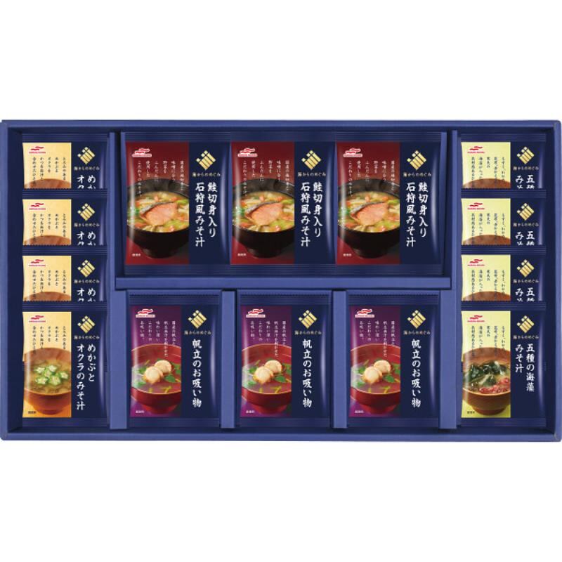 商品内容:●鮭切り身入り石狩風みそ汁×3、帆立のお吸い物×3、めかぶとオクラのみそ汁×4、五種の海藻みそ汁×4(計14食)(フリーズドライ)