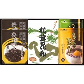 丹波地方特産の丹波黒大豆を使用した煮豆、丹波大納言小豆を使用した2種類のぜんざい、厳選した素材を龍野産本醸造醤油で丁寧に炊き上げた松茸昆布の詰合せです。