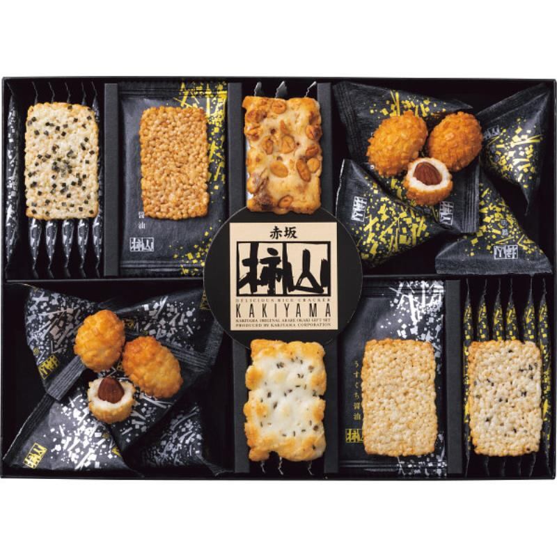 赤坂柿山の代表商品の詰合せ。もち米の粒の姿をそのままに焼き上げた「慶長」、アーモンドを丸ごと一粒おかきで包んだ「慶凰」、もち米の風味を存分に楽しめる「かきもち」の詰合せです。黒地に金銀模様のシックな装いはシーンを選ばずご好評いただいております。