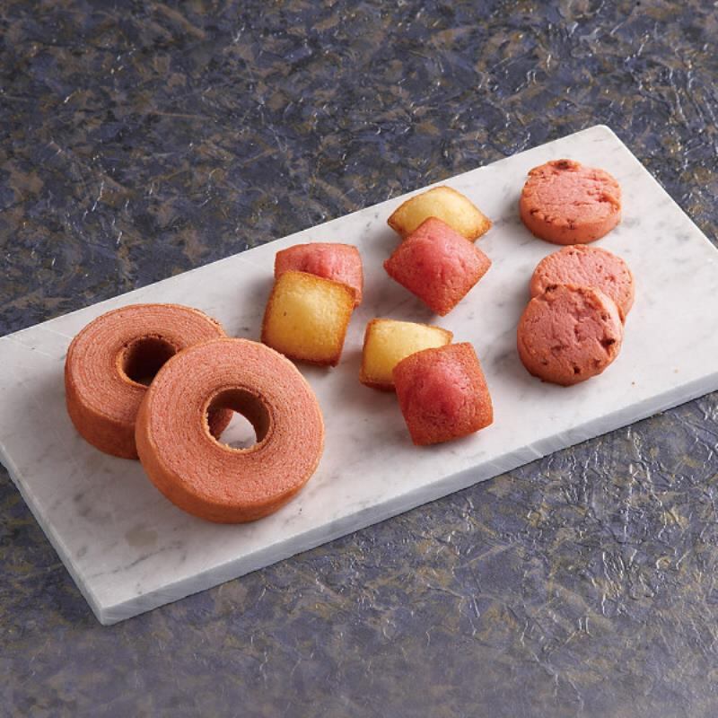国産小麦とあまおう苺濃縮果汁を使用し、苺の風味と味わいを生かして一層一層丁寧に焼き上げたバウムクーヘンと、ひとくちサイズのしっとりとした食感で仕上げ、トンネルオーブンを使用することによりふんわりと焼き上げたフィナンシェ、ほろろとした食感とフリーズドライのいちごを使用したざくっとした食感のアイスボックスクッキーの詰め合わせです。