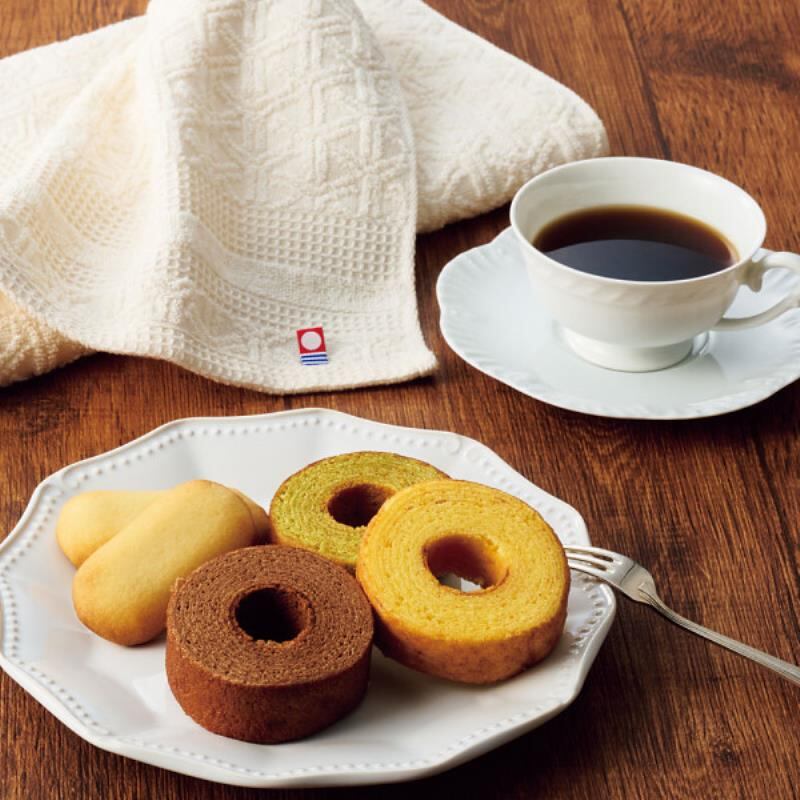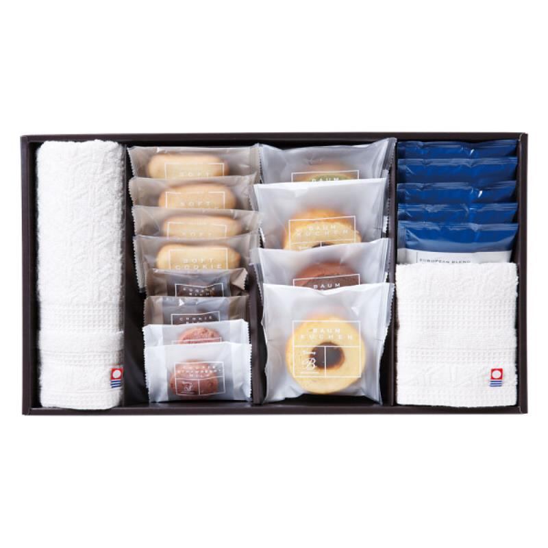 商品内容:●今治産フェイスタオル(約34×75cm・綿100%・日本製)1枚・ウォッシュタオル(約34×35cm・綿100%・日本製)1枚・ミニバウム(バニラ×2・チョコ×1・抹茶×1)・ソフトクッキー×4・クッキー(いちごミルク×2・ココア×2)・ドリップコーヒー8g×5