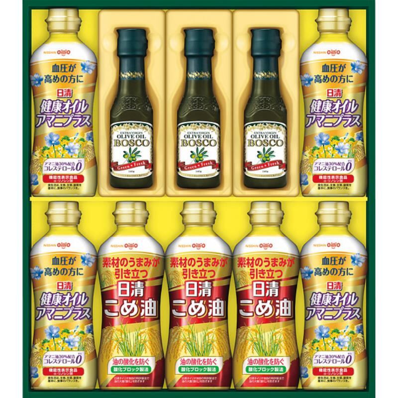 商品内容:●ボスコエキストラバージンオリーブオイル140g×3、こめ油350g×3、日清健康オイルアマニプラス350g×4