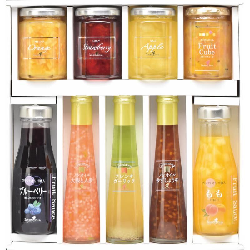 商品内容:●ジャム145g×3(オレンジマーマレード、いちご、りんご)、ミックスジャム155g(フルーツキューブ)、ドレッシング122ml×3(ノンオイル大根と人参、フレンチガーリック、ノンオイルゆずしょうゆ)、フルーツソース220g(ブルーベリー)、フルーツソース215g(もも)