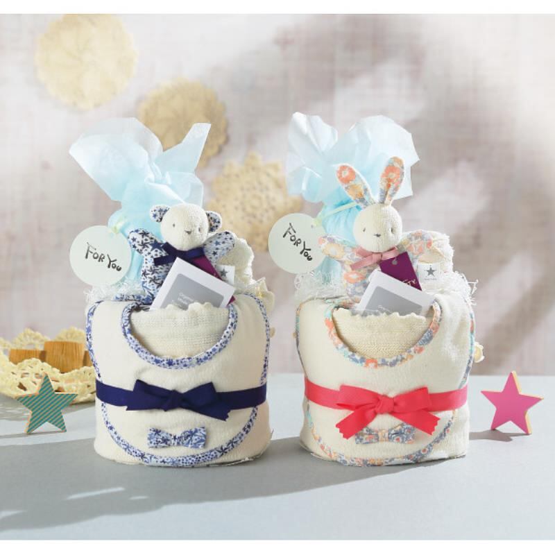 リバティプリントを使用した人気のベビーアイテムをセットしたおむつケーキです。スタイ・ラトル・腹巻・オーガニックタオル(今治生産)をパンパースSサイズ10枚を組み合わせておむつケーキにしました。