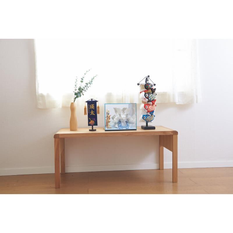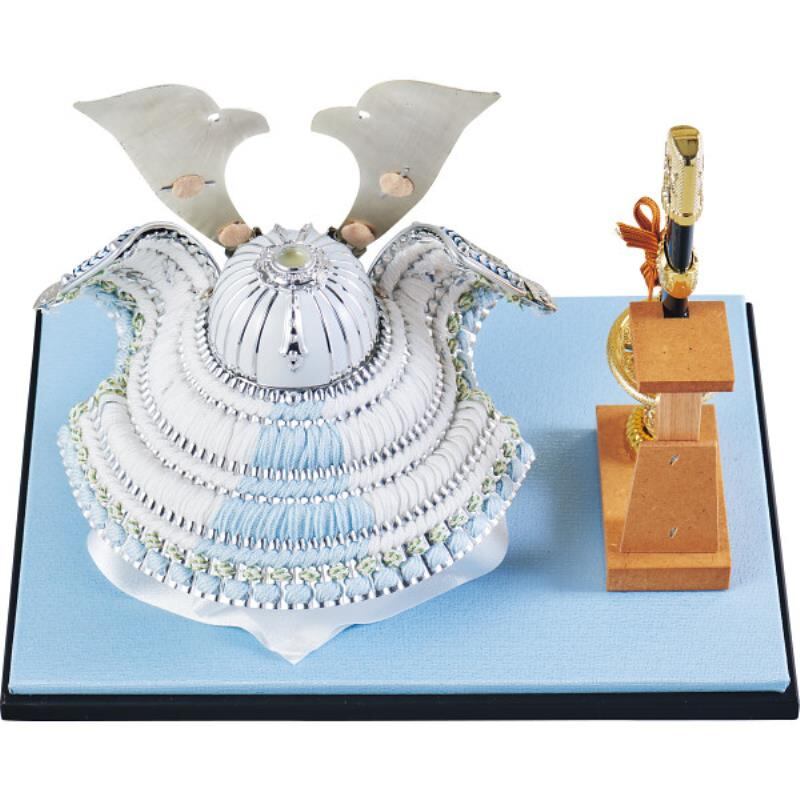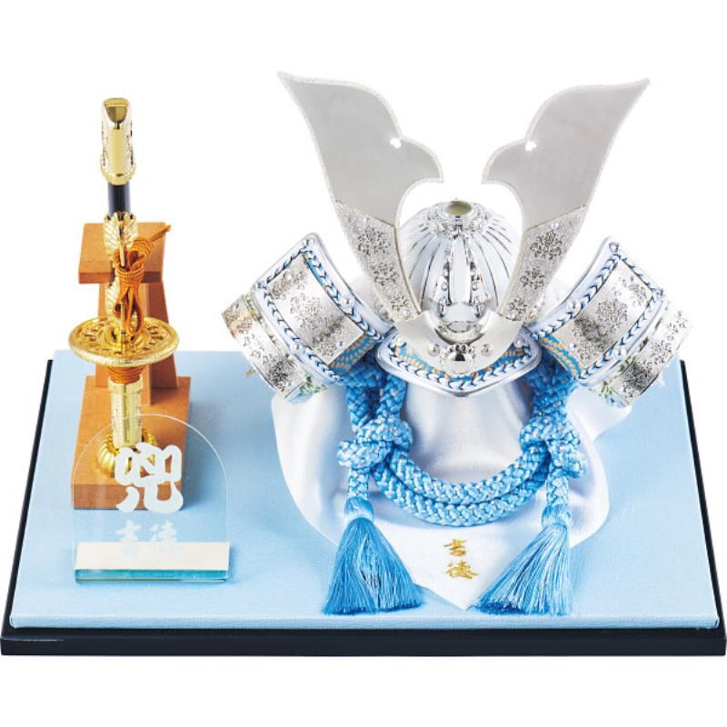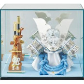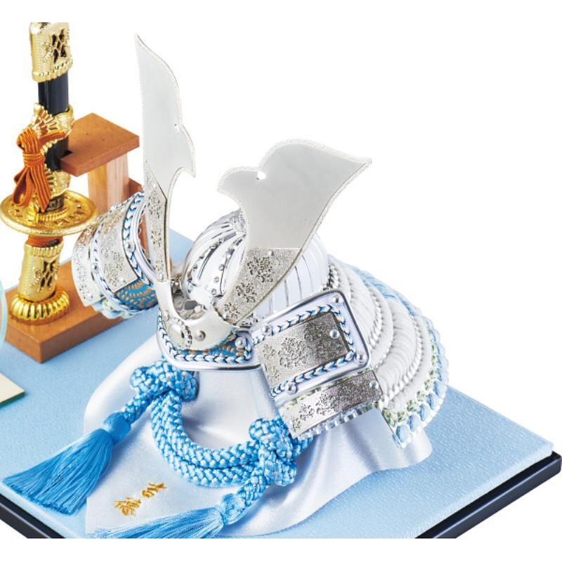済み渡る五月晴れの空のような青色を、シャープな銀の兜にあしらったケース飾りです。