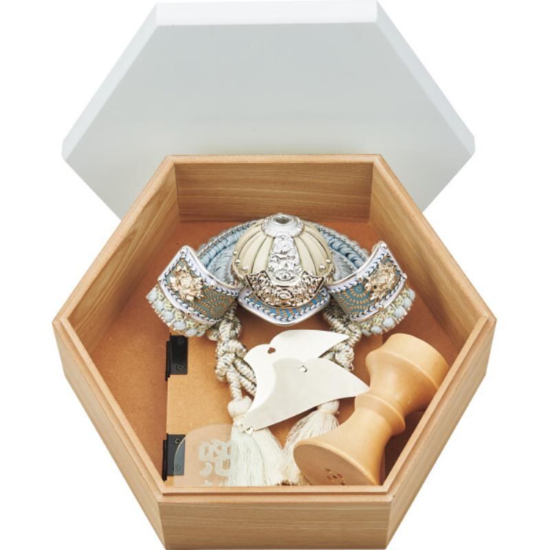 晴れ渡る五月の空を思わせる、明るい木目調の兜収納飾りです。