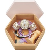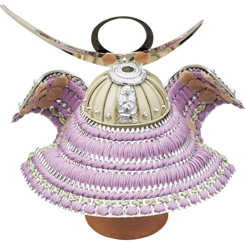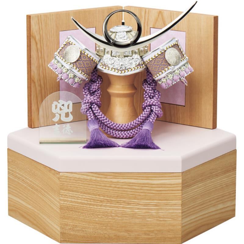 明るい木目調の収納箱に、藤色の忍び緒が目を引く兜をあわせました。