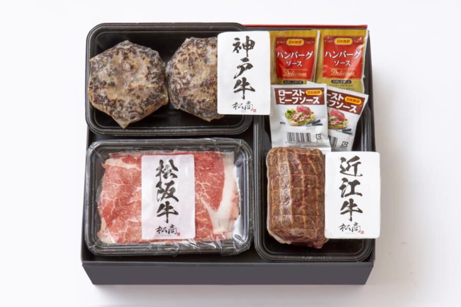 商品内容:松阪牛スライス:200g×1、神戸牛ハンバーグ:130g×2、ハンバーグソース:20g×2、近江牛ローストビーフ:200g×1、ローストビーフソース:20g×2