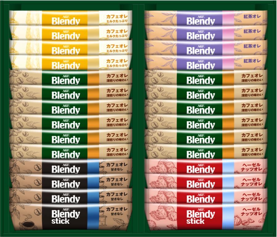 商品内容:ブレンディスティック(カフェオレ14g×12、カフェオレミルクたっぷり14g×4、カフェオレ甘さなし11.4g×4、紅茶オレ11g×4、ヘーゼルナッツオレ11g×4)