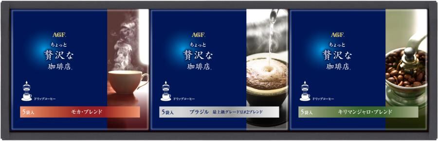 商品内容:ちょっと贅沢な珈琲店ドリップコーヒーブラジル最上級グレード豆#2ブレンド(8g×5)×1、ちょっと贅沢な珈琲店ドリップコーヒーモカ・ブレンド(8g×5)×1、ちょっと贅沢な珈琲店ドリップコーヒーキリマンジャロ・ブレンド(8g×5)×1