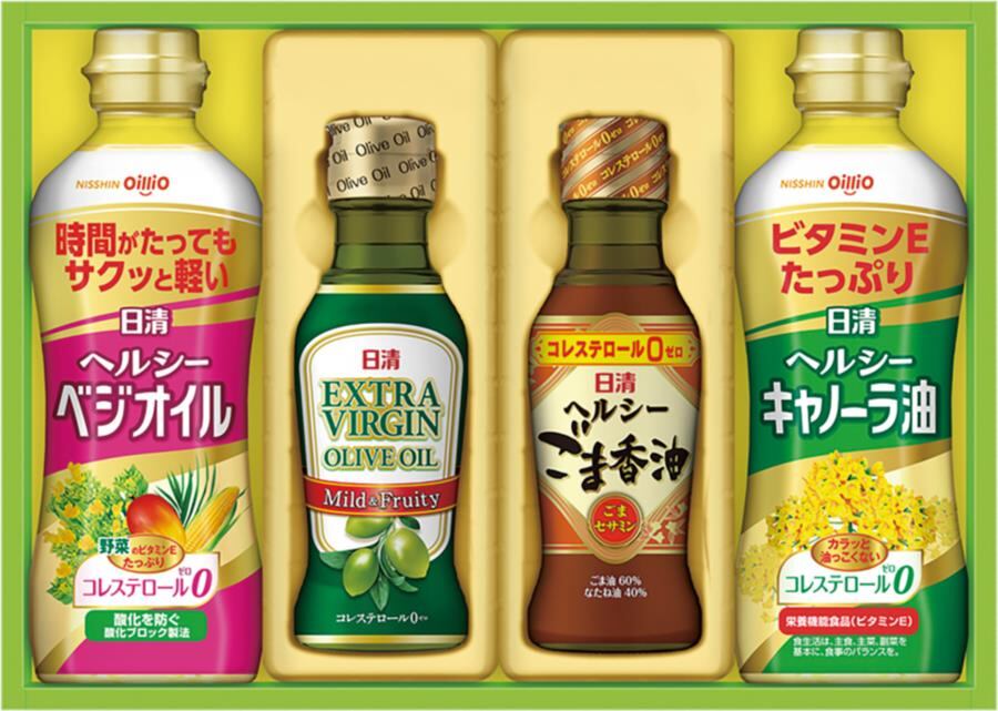 商品内容:ヘルシーキャノーラ油350g、エキストラバージンオリーブオイル145g、ヘルシーごま香油145g、ヘルシーベジオイル350g