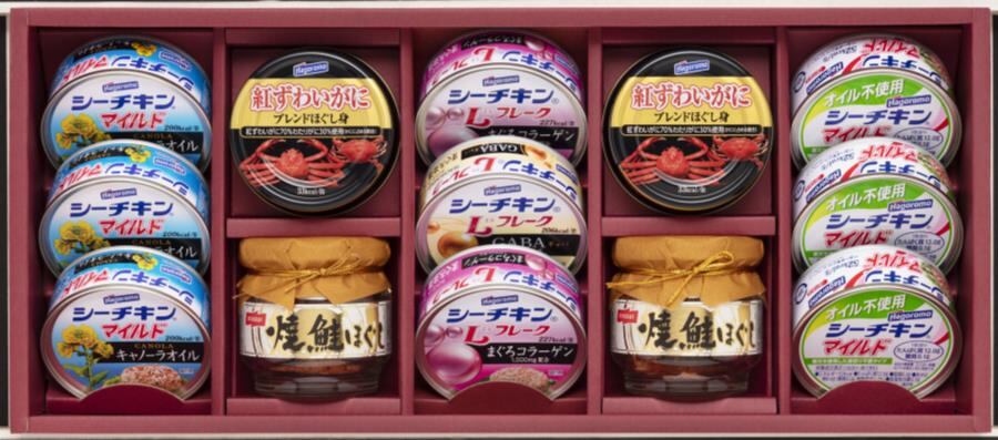 商品内容:シーチキンマイルドキャノーラオイル70g×3、紅ずわいがにブレンドほぐし身55g×2、焼鮭ほぐし50g×2、シーチキンLフレークコラーゲン入り70g×2、シーチキンLフレークGABA入り70g×1、オイル不使用シーチキンマイルド70g×3