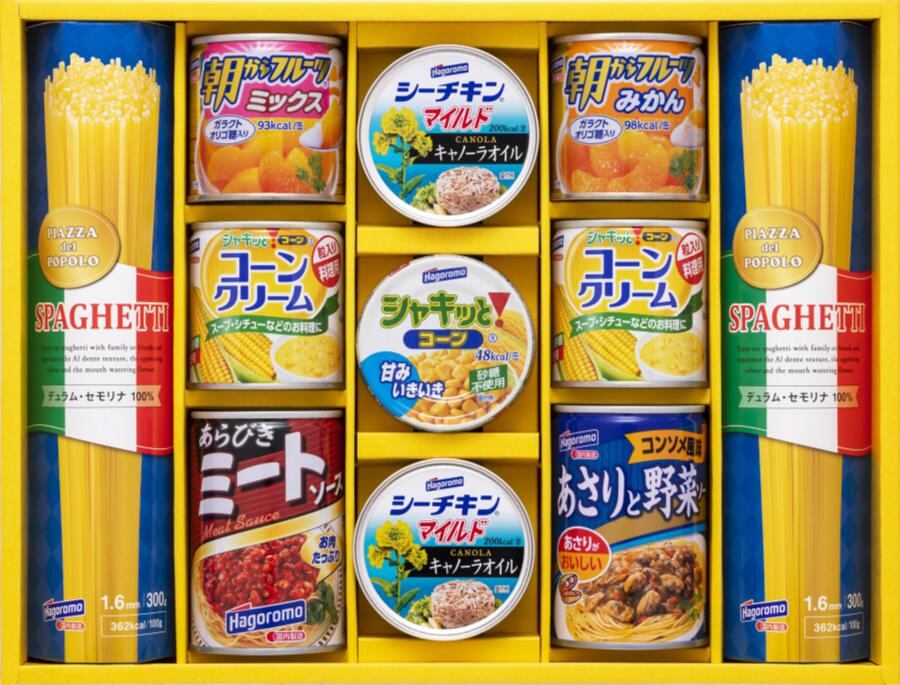 商品内容:スパゲッティ300g×1、朝からフルーツミックス190g×1、シャキッと!コーンクリーム180g×1、あらびきミートソース290g×1、シーチキンマイルドキャノーラ70g×2、シャキッと!コーン65g×1