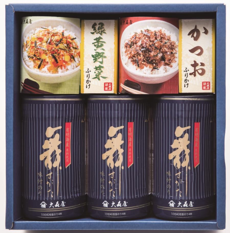 商品内容:味付のり(10切32枚)×3本、緑黄野菜ふりかけ(2.5g×10袋)、かつおふりかけ(2.5g×10袋)