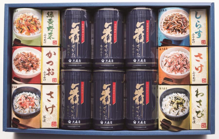 商品内容:味付のり(10切32枚)×6本、緑黄野菜ふりかけ(2.5g×10袋)、かつおふりかけ(2.5g×10袋)、さけふりかけ(2.5g×10袋)、しらすふりかけ(2.5g×10袋)、さけ茶漬(6.4g×6袋)、わさび茶漬(5.6g×6袋)