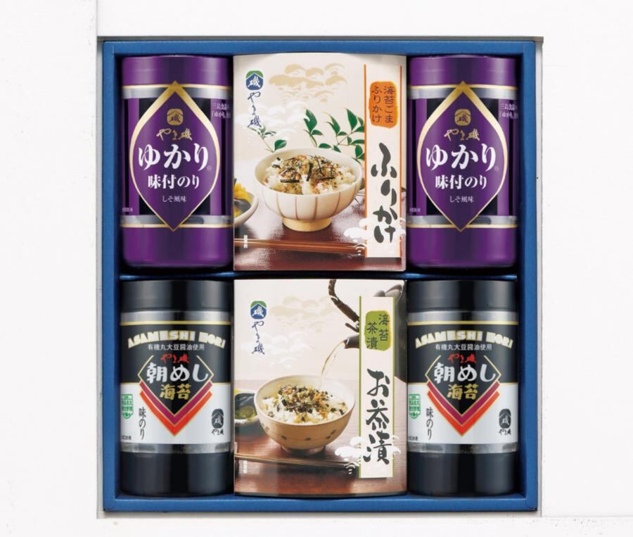 商品内容:味付のり (8切26枚)×2、ゆかり味のり (8切26枚)×2、のり茶漬 (5.5g×4袋)、のりふりかけ (5g×4袋)