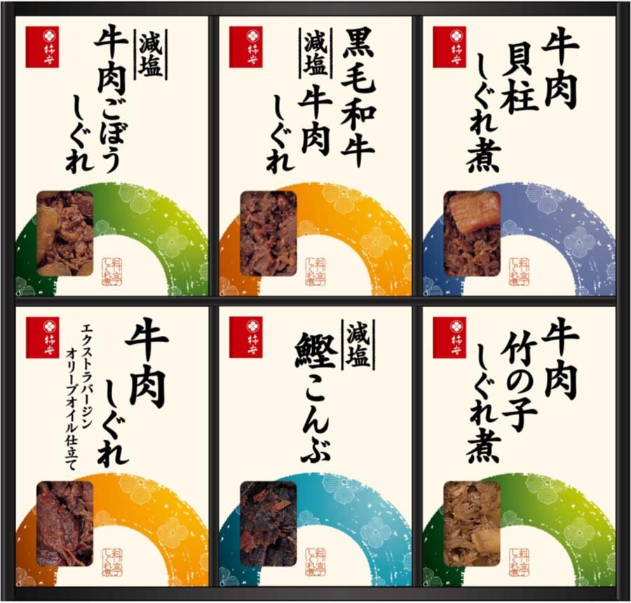 商品内容:黒毛和牛 減塩牛肉しぐれ50g、牛肉しぐれエクストラバージンオリーブオイル仕立て50g、減塩 牛肉ごぼうしぐれ50g、牛肉貝柱しぐれ煮50g、牛肉竹の子しぐれ煮50g、減塩 鰹こんぶ50g