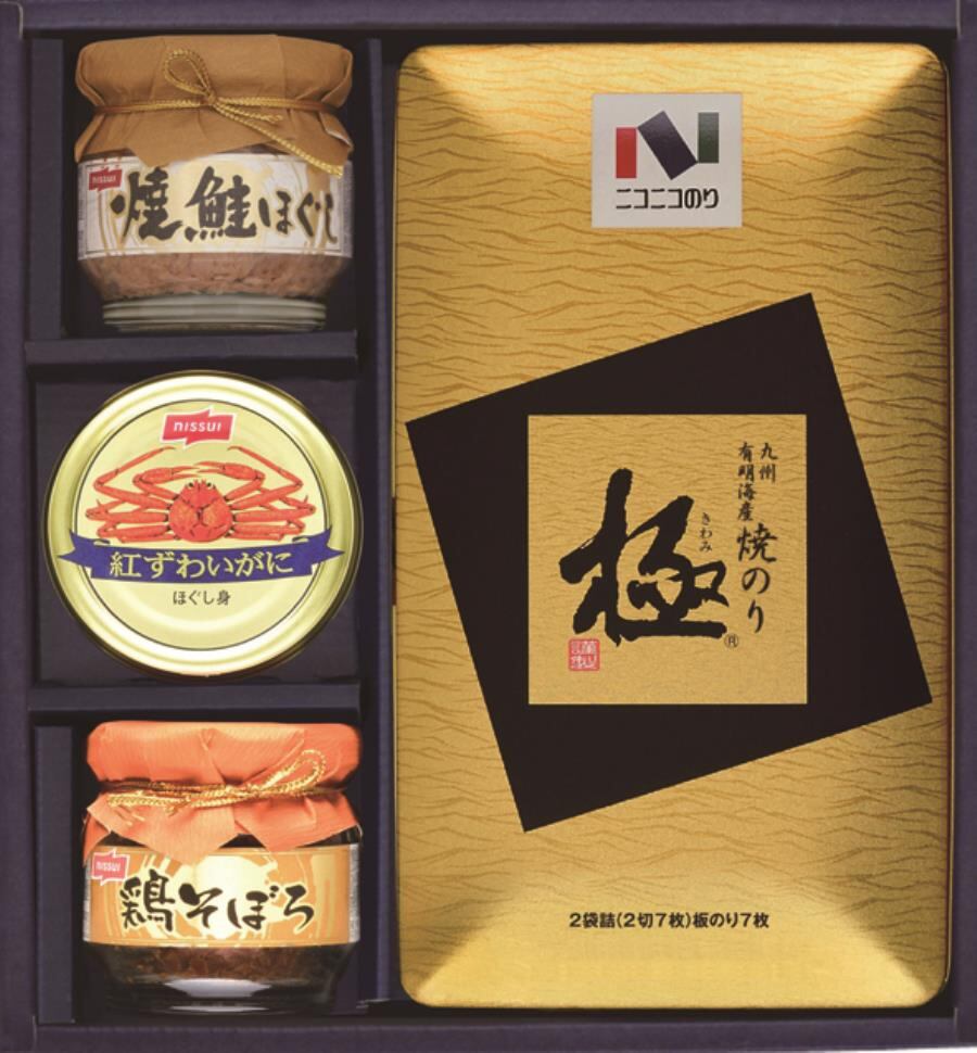 商品内容:焼のり半裁缶2袋詰(2切7枚)紅ずわいがにほぐし身(55g)、焼鮭ほぐし瓶(50g)、鶏そぼろ瓶(50g)