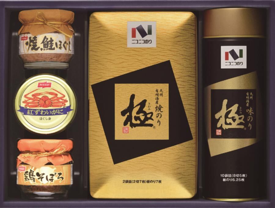 商品内容:味のり丸缶10袋詰(8切5枚)、焼のり半裁缶2袋詰(2切7枚)、紅ずわいがにほぐし身(55g)、焼鮭ほぐし瓶(50g)、鶏そぼろ瓶(50g)