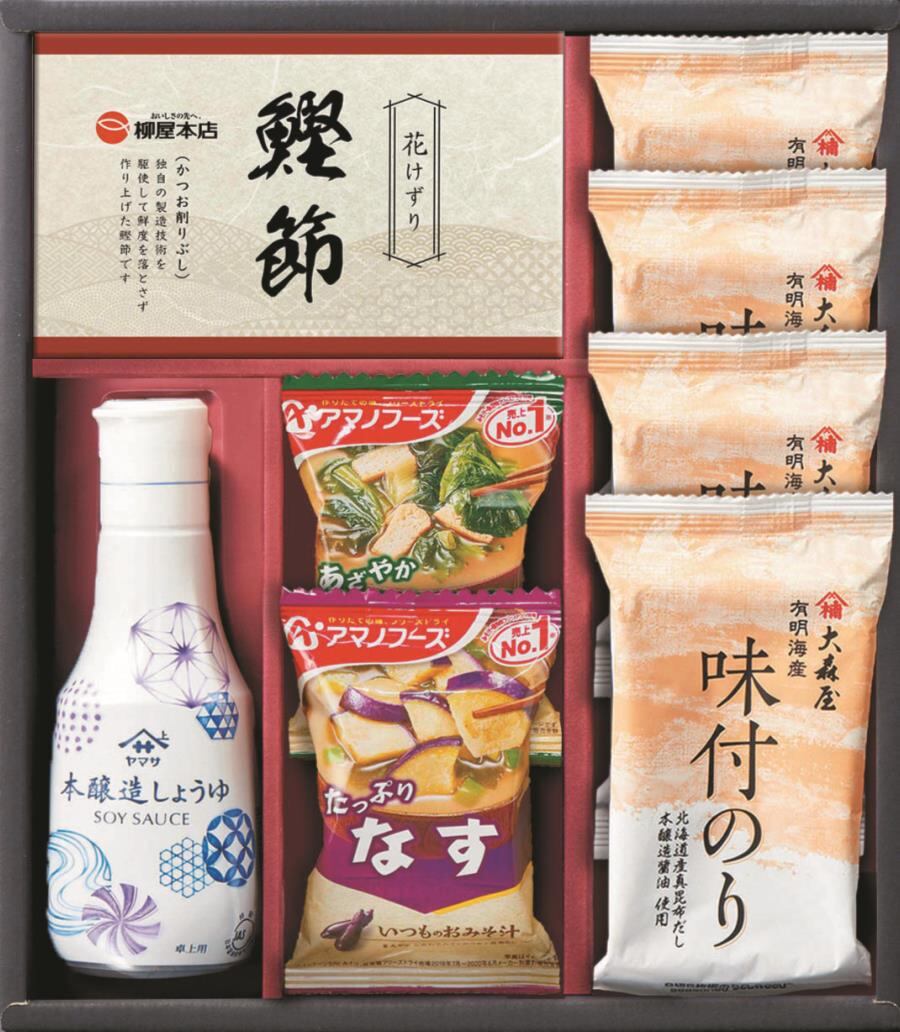 商品内容:ヤマサ本醸造しょうゆ200ml、アマノフーズいつものおみそ汁(なす、ほうれん草)、大森屋味付のり(8切5枚)×4、かつお削り節(3g×3)