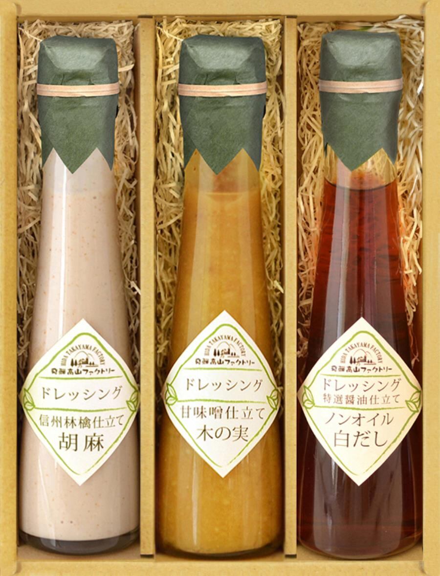 商品内容:信州林檎仕立て胡麻ドレッシング120ml×1本、特選醤油仕立てノンオイル白だしドレッシング120ml×1本、甘味噌仕立て木の実ドレッシング120ml×1本