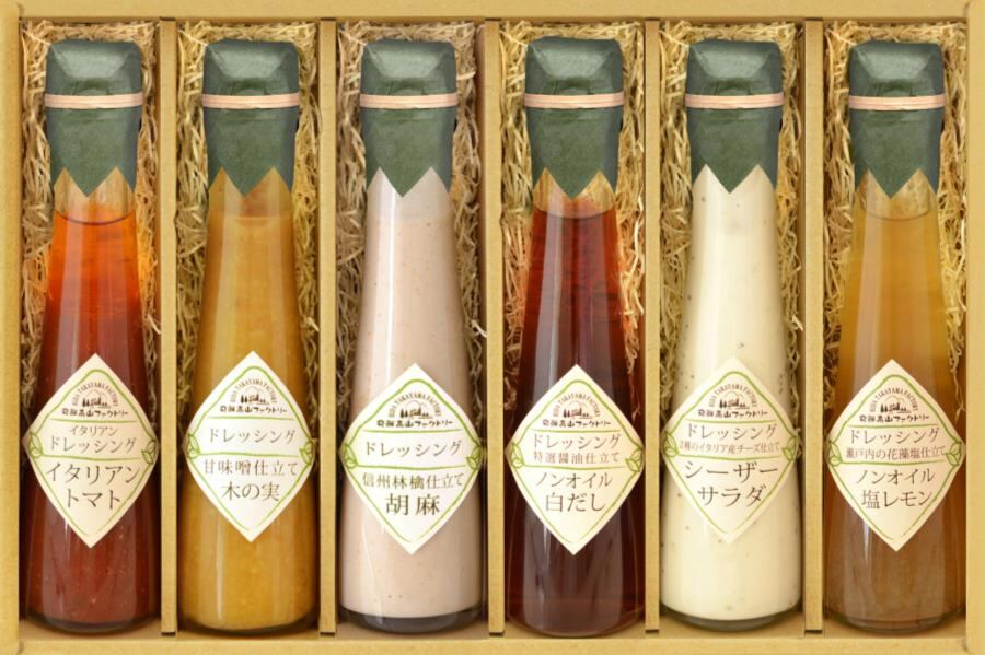 商品内容:イタリアントマトのイタリアンドレッシング120ml×1本、特選醤油仕立てノンオイル白だしドレッシング120ml×1本、甘味噌仕立て木の実ドレッシング120ml×1本、信州林檎仕立て胡麻ドレッシング120ml×1本、2種のイタリア産チーズ仕立てシーザーサラダドレッシング120ml×1本、瀬戸内の花藻塩仕立てノンオイル塩レモンドレッシング120ml×1本