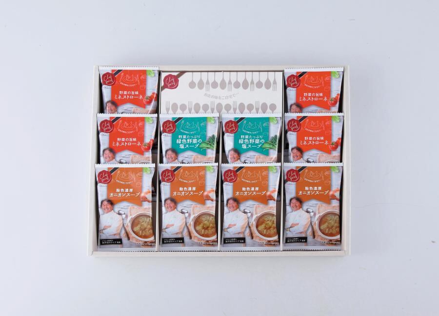 商品内容:オニオンスープ×4、ミネストローネ×4、緑色野菜の塩スープ×2