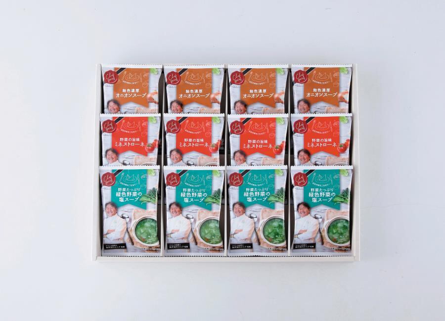 商品内容:オニオンスープ×4、ミネストローネ×4、緑色野菜の塩スープ×4