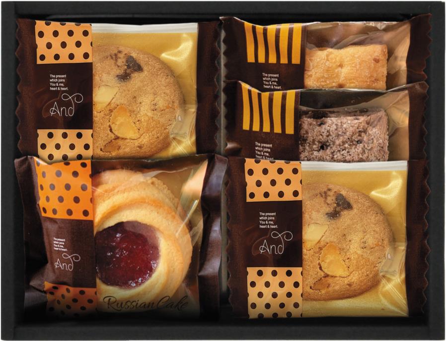 商品内容:ロシアケーキ(ブルーベリーサン)、スクエアパイ(プレーン、ショコラ)、ナッツとチョコのざっくりクッキー×2