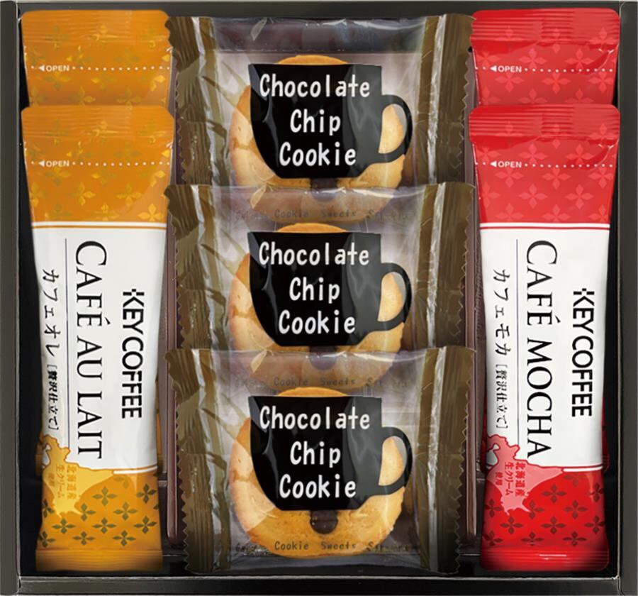 商品内容:チョコチップクッキー×3、キーコーヒーカフェオレスティック7g×2、キーコーヒーカフェモカスティック7.8g×2