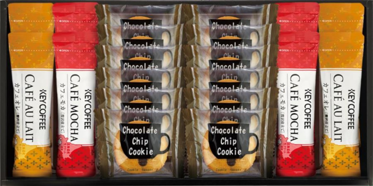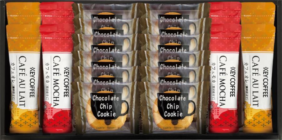 商品内容:チョコチップクッキー×12、キーコーヒーカフェオレスティック7g×4、キーコーヒーカフェモカスティック7.8g×4