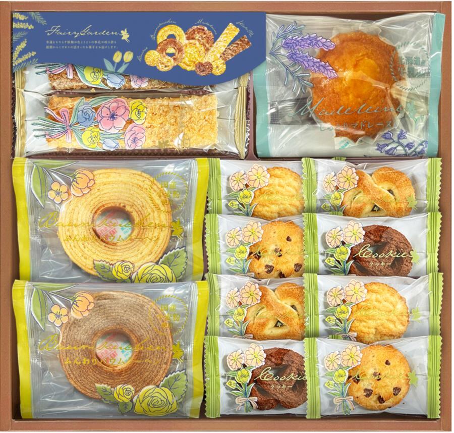 商品内容:クッキー(ミルク・メープル・チョコチップ・ショコラ)×各2、スティックパイ(メープル・ショコラ)×各1、マドレーヌ(プレーン)×1、バウムクーヘン(バニラ・ココア)×各1