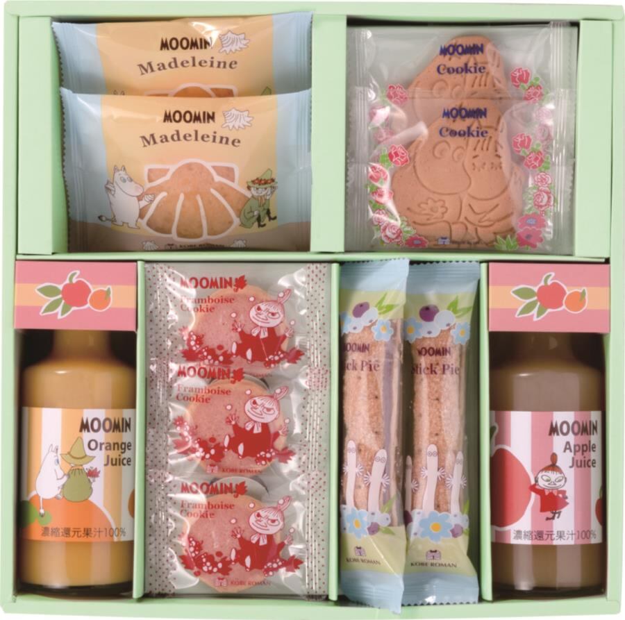 商品内容:アップルジュース・オレンジジュース(180ml)×各1、ブルーベリースティックパイ×2、バニラマドレーヌ×2、フランボワーズクッキー×3、バニラ型押しクッキー×2