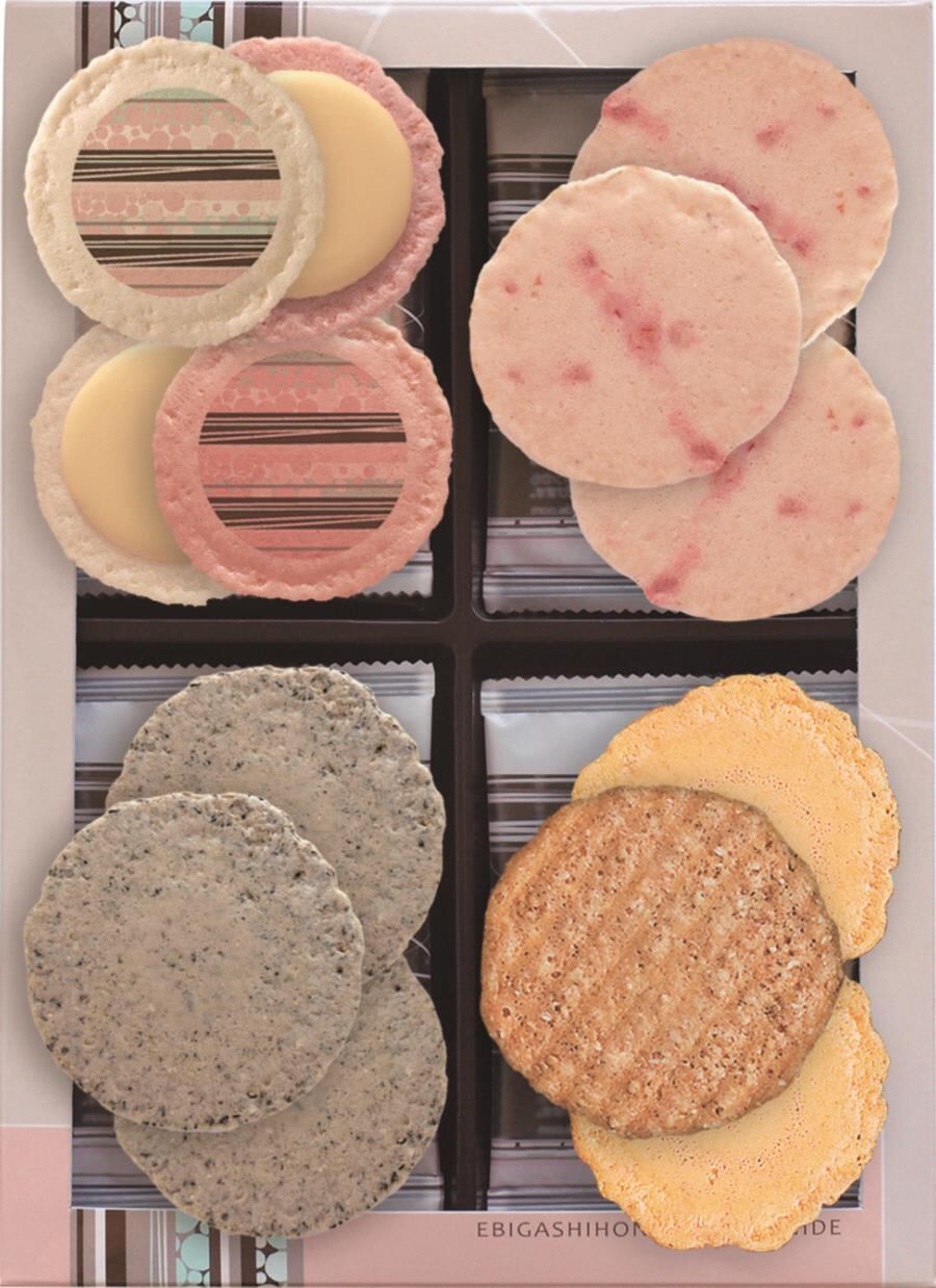 商品内容:紅白せんべいチーズサンド×2袋、ふた焼ごま×2袋、黒ごまえび煎餅×3袋、紅生姜えび煎餅×3袋、えび柚子胡椒×2袋 計12袋入