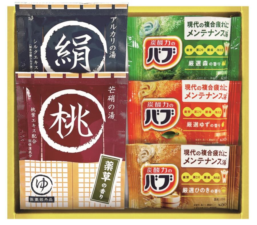 商品内容:バブ(森の香り、ゆず、ひのき 各1)、入浴剤(湯屋めぐり アルカリの湯 絹、芒硝の湯 桃 各1)