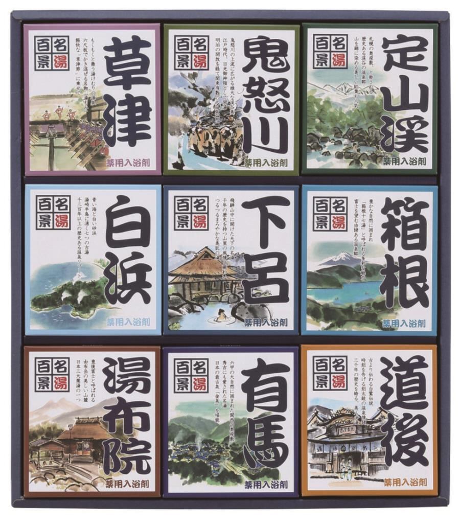 商品内容:入浴剤25g×30(鬼怒川×4、下呂×4、有馬×4、草津×3、白浜×3、湯布院×3、定山渓××3、箱根×3、道後×3)