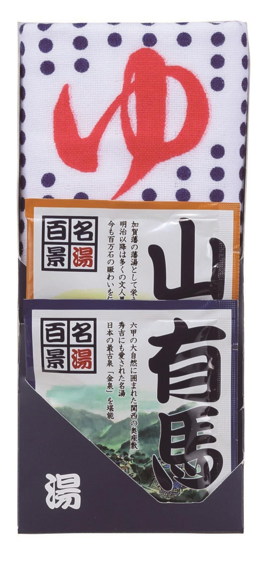 商品内容:入浴剤25g×2(山代・、有馬)、ガーゼタオル×1(約26×67cm)