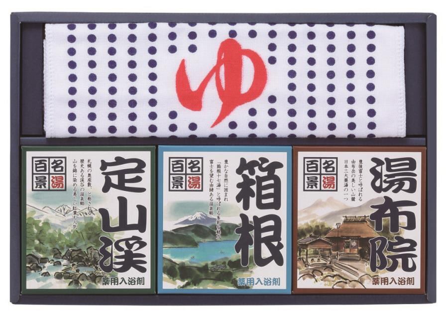 商品内容:入浴剤25g×9(定山渓、箱根、湯布院)各3、ガーゼタオル×1(約26×67cm)