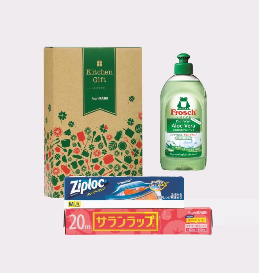 商品内容:サランラップ(22cm×20m)×1、ジップロックフリーザーバッグ(M5枚入)×1、フロッシュ食器用洗剤(アロエヴェラ300ml)×1