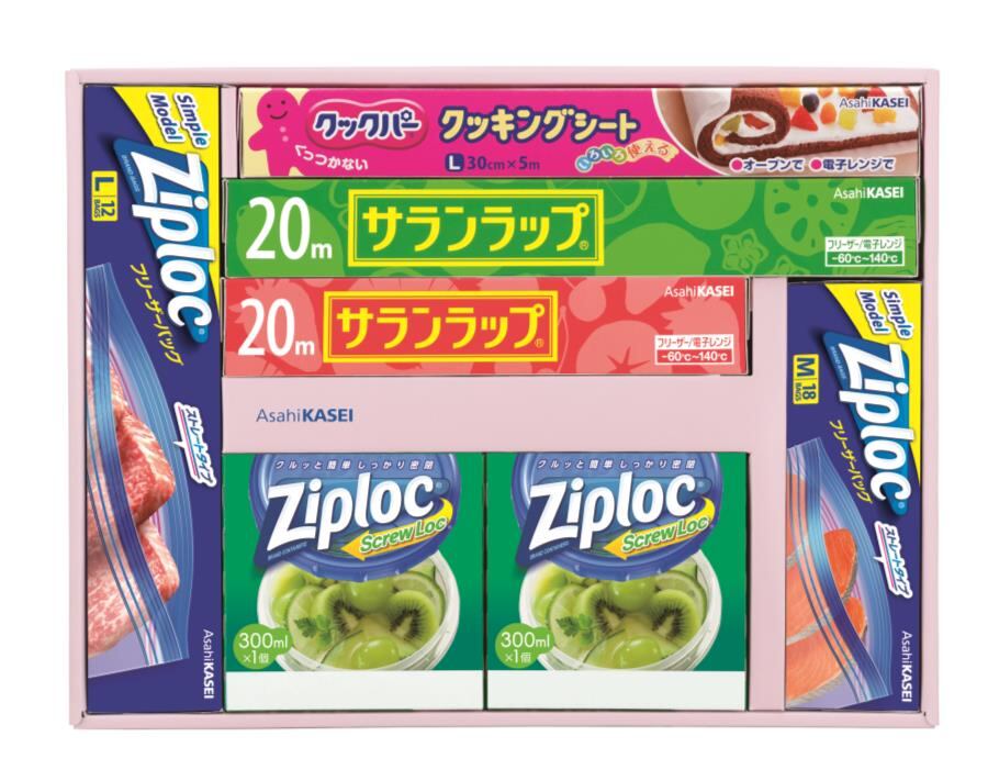 商品内容:サランラップ(30cm×20m)×1、サランラップ(22cm×20m)×1、ジップロックフリザーバッグ(M18枚入)×1、ジップロックフリザーバッグ(L12枚入)×1ジップロックスクリューロック(300ml1個入)×2、クックパークッキングシート(Lサイズ30cm×5m)×1