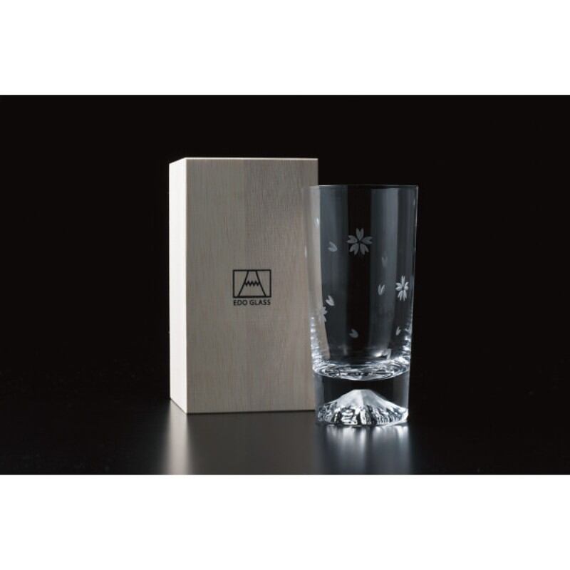 グラスの底にそびえ立つ麗峰富士。江戸時代からの硝子製法を受け継いだ「江戸硝子」と富士山がコラボレーションしたタンブラーです。表情豊かな富士山を眺めながら楽しむ、寛ぎの時間をプレゼントしませんか。注いだ飲み物の色合いが山肌に反射してさまざまな表情の富士山を楽しむことが出来ます。桜柄の布に包んでお届けします。
