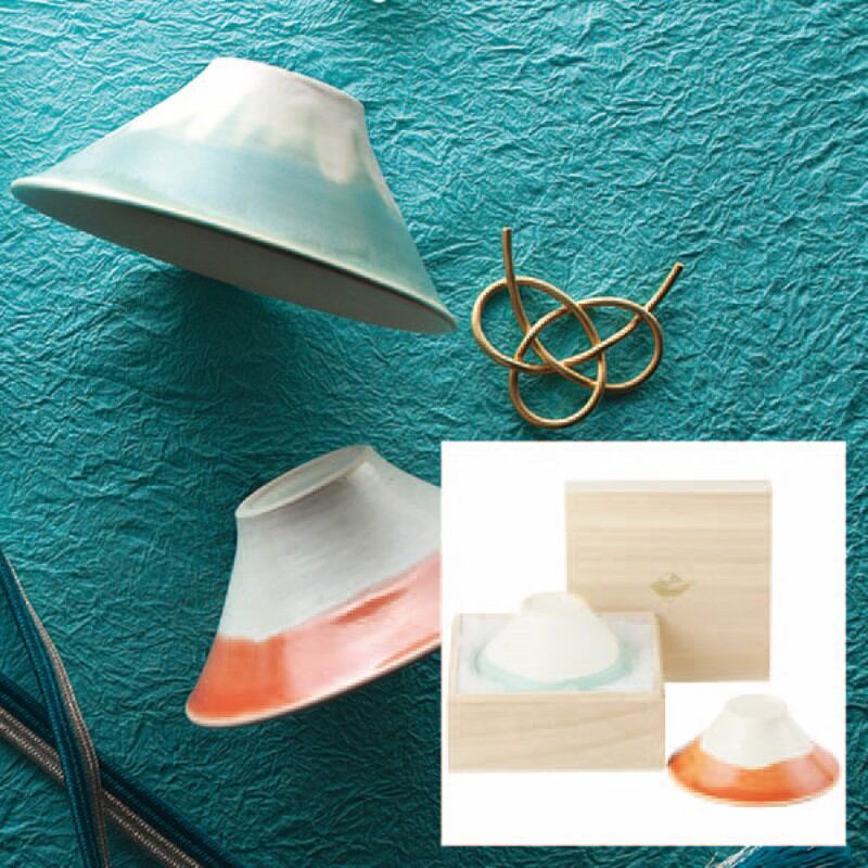 日本の象徴でもある富士を象った夫婦茶碗。青富士と赤富士の夫婦茶碗は一つ一つ釉薬の掛け方が違い、あなただけの富士山をお楽しみ頂けます。雲海をイメージした綿に包み、桐箱に入れてお届けします。