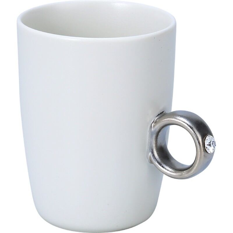 指輪をはめるように、カップの取手に薬指を入れてください。カップを握ると、まるで本物の指輪をつけているかのようです。リングに見立てた取手部分は、熟練の職人が、一つひとつ手塗りで彩色を施し、クリスタルガラスを埋め込みました。箱を開けた時から、実際に手に持つまでのストーリーもデザインのひとつと考えた美濃焼のマグカップです。