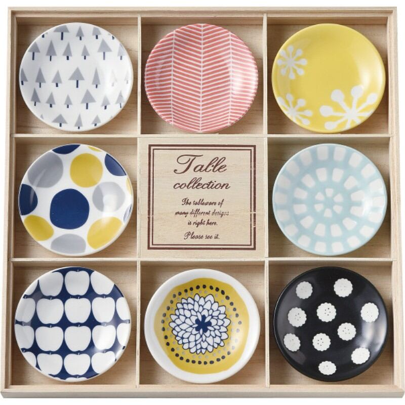 食卓にインテリアに様々なシーンで使える絵変わり小皿。北欧テイストのデザインも手のひらサイズも女性のかわいい!をくすぐるアイテムです。木箱入りで開けたときにパッと全部の柄が見えるのもポイントです。